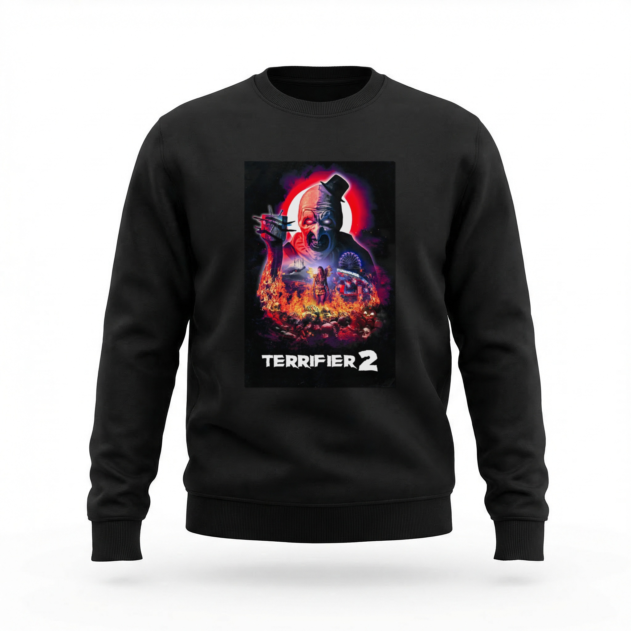 Art the Clown voltou — e desta vez mais implacável, mais grotesco, mais sobrenatural. Terrifier 2 (2022), dirigido por Damien Leone, chocou plateias ao redor do mundo com cenas de gore extremo e efeitos práticos que levaram espectadores ao limite físico da experiência cinematográfica. O palhaço assassino consolidou-se como ícone absoluto do slasher contemporâneo, ressuscitando o terror visceral que o gênero precisava. Art não fala, não negocia — apenas massacra com uma brutalidade quase ritualística, enquanto a Garota Pálida caminha ao seu lado como sombra do além. O filme arrecadou milhões com orçamento mínimo e fez história como um dos títulos de horror independente mais impactantes da década. Na blusa moletom careca, o horror se veste com estilo limpo. Sem capuz, sem excessos — apenas a estampa nítida de um dos vilões mais aterrorizantes do cinema recente, em tecido quente e confortável para os dias em que o frio pede um visual digno do caos noturno. Blusa moletom careca com tecido confortável e estampa nítida.