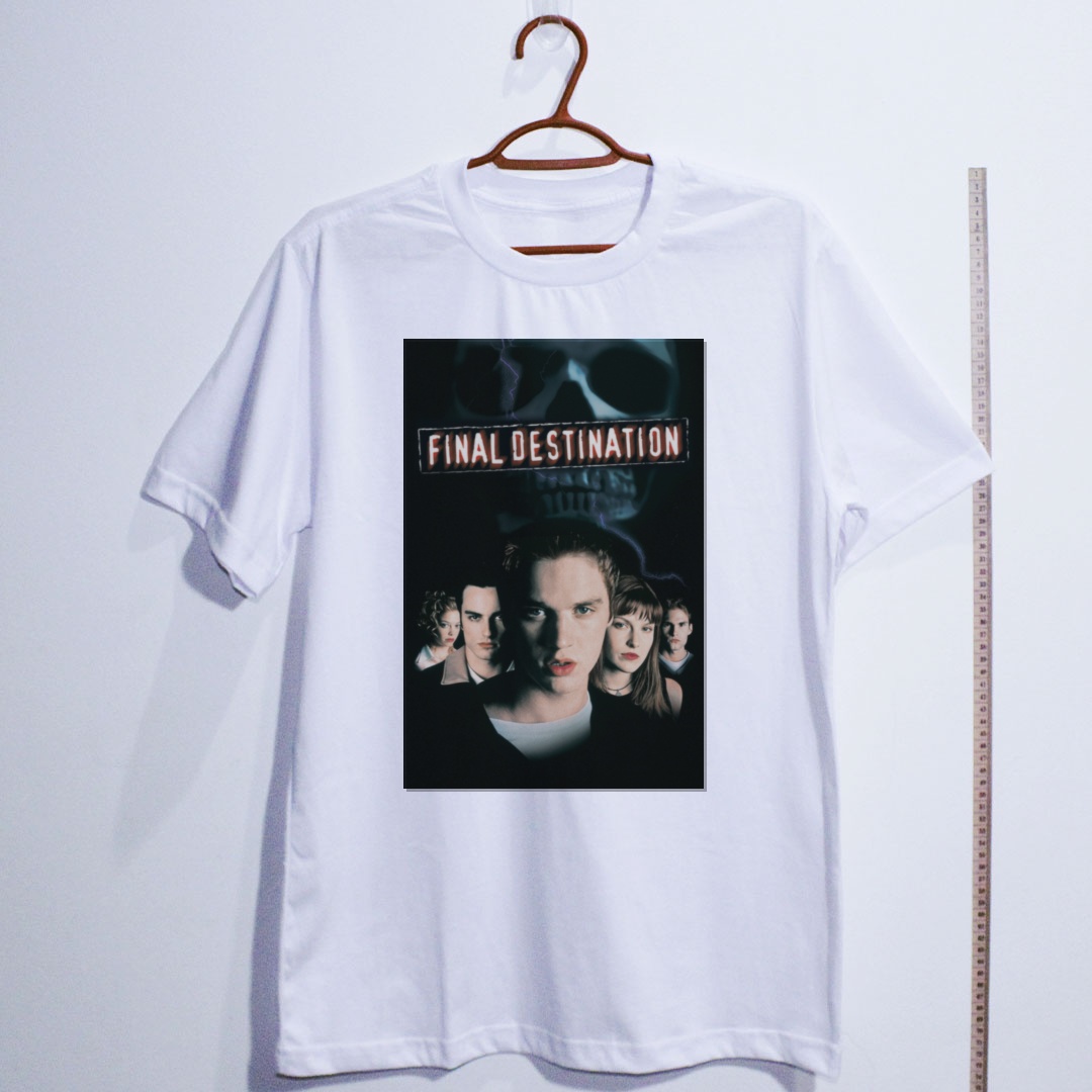 Em 2000, James Wong apresentou ao mundo uma premissa aterrorizante: e se a Morte tivesse um plano — e você fosse o único capaz de enxergá-lo? Final Destination, lançado no Brasil como Premonição, transformou a ideia de fatalidade em uma arte macabra de causa e efeito. Alex Browning tem a visão de que seu avião vai explodir antes da decolagem. Ele sai. Salva alguns colegas. E então a Morte começa a cobrar a dívida, uma vítima por vez, com sequências elaboradas que são ao mesmo tempo absurdas e genuinamente perturbadoras. A franquia se tornou cult instantâneo, definindo uma geração inteira de fãs do horror com sua filosofia sombria: não existe escapatória, apenas adiamento. Não há monstro, não há assassino mascarado — só o destino, paciente e inevitável. Essa camiseta traz o terror direto do cinema para o seu guarda-roupa. Camiseta de algodão com estampa nítida e tecido macio. Disponível em diversos tamanhos.