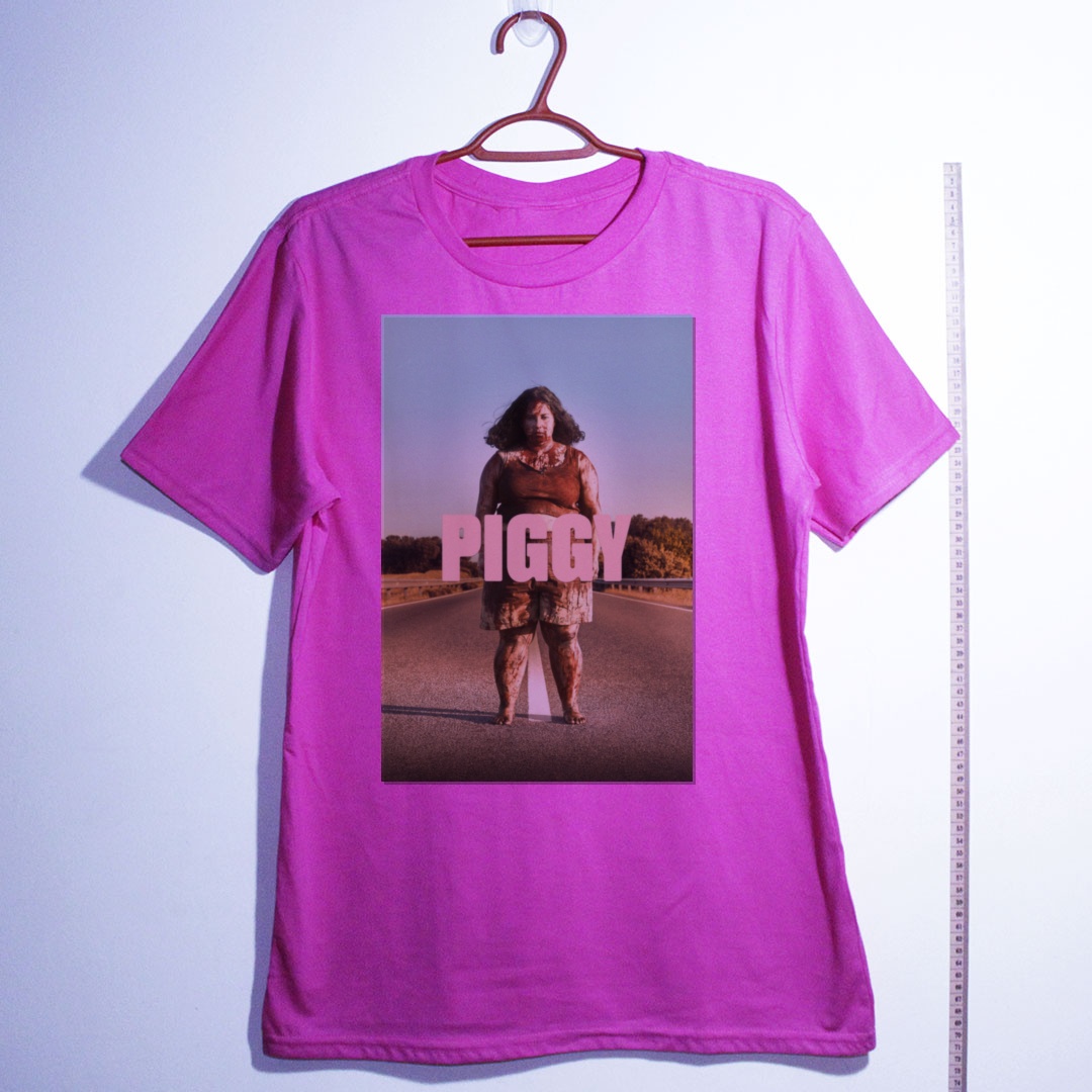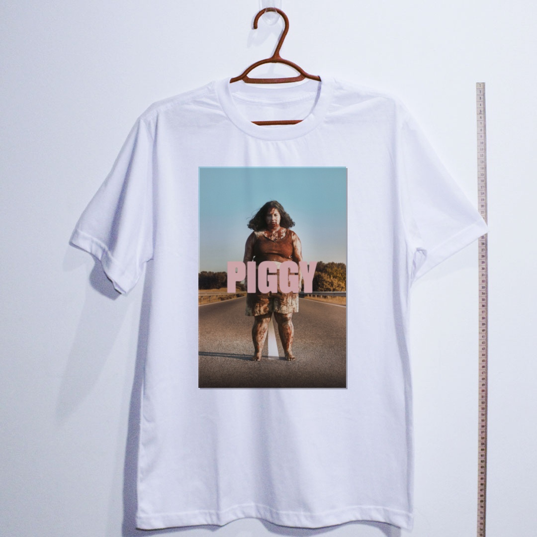 "Piggy" (2022), dirigido pela espanhola Carlota Pereda, é um dos filmes de terror mais viscerais e perturbadores do cinema europeu recente. A história de Sara — uma jovem marginalizada e humilhada pelas colegas — ganha contornos sombrios quando um assassino misterioso passa a eliminar suas agressoras. Entre o horror psicológico e a cumplicidade silenciosa, o filme confronta o espectador com uma pergunta incômoda: o que você faria no lugar dela? Premiado no Sundance 2022, "Piggy" virou cult instantâneo do terror moderno, combinando brutalidade, angústia e uma atmosfera densa que não abandona quem assiste. Uma obra que vai fundo na ferida — e não pede desculpa. Essa camiseta traz o terror direto do cinema para o seu guarda-roupa. Camiseta de algodão com estampa nítida e tecido macio. Disponível em diversos tamanhos.