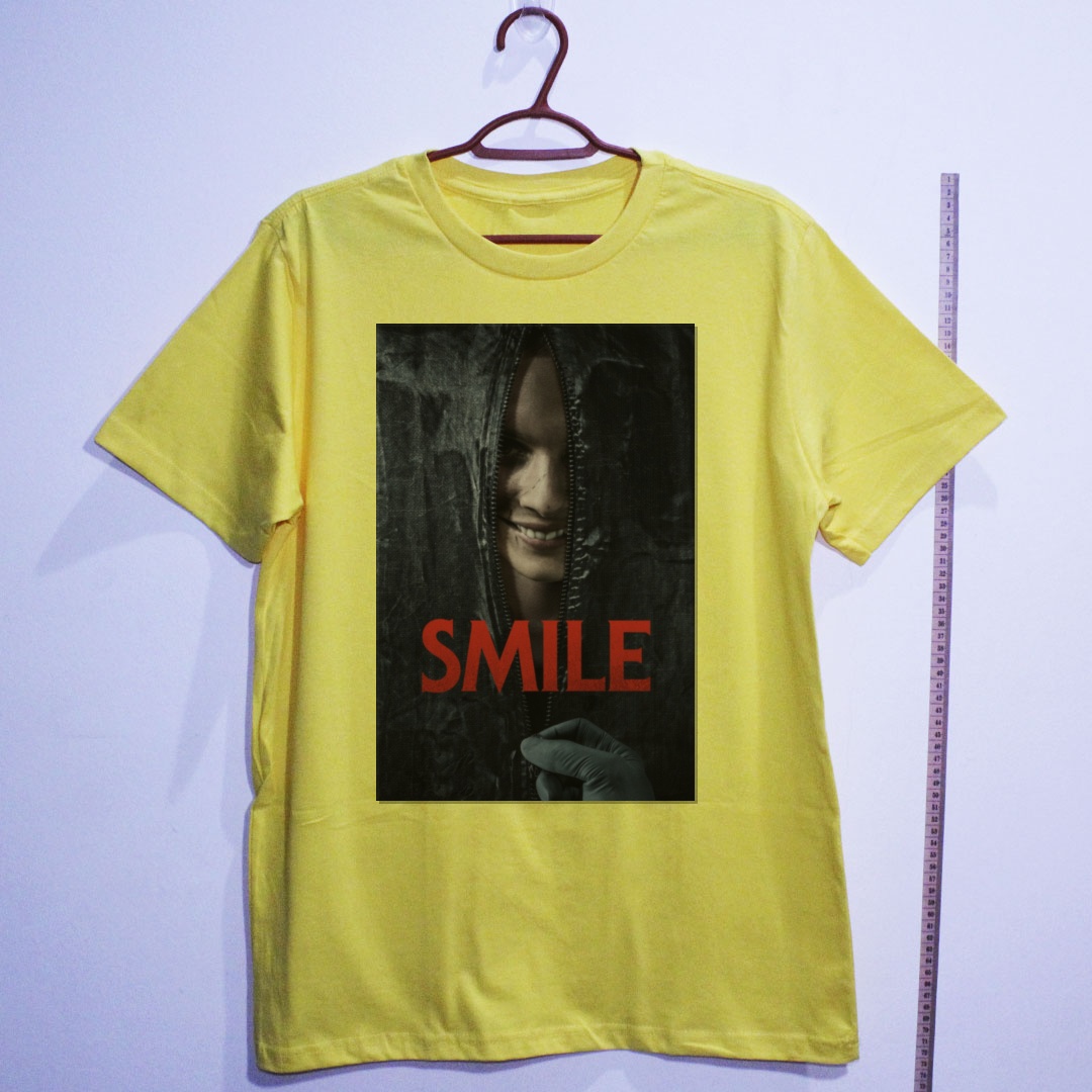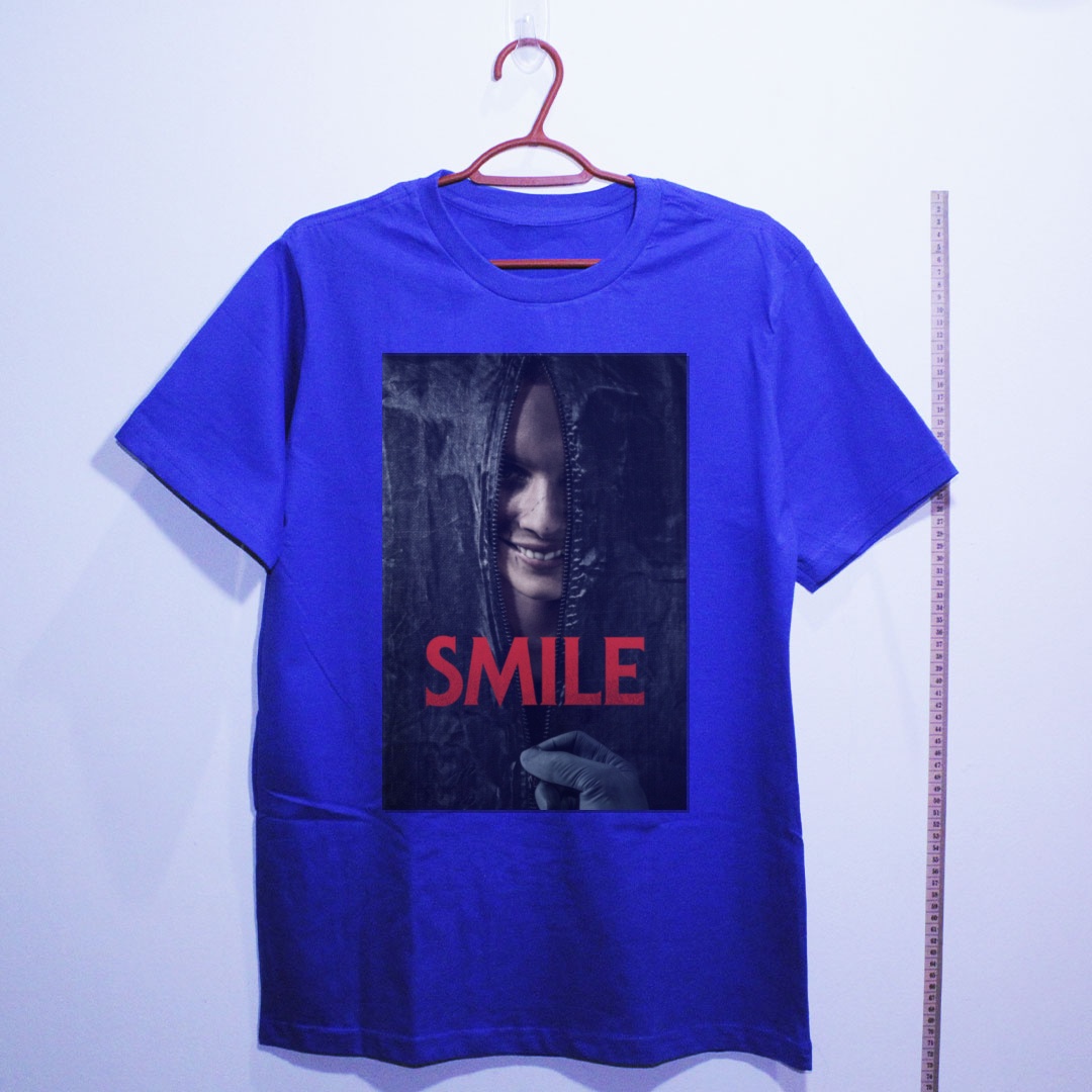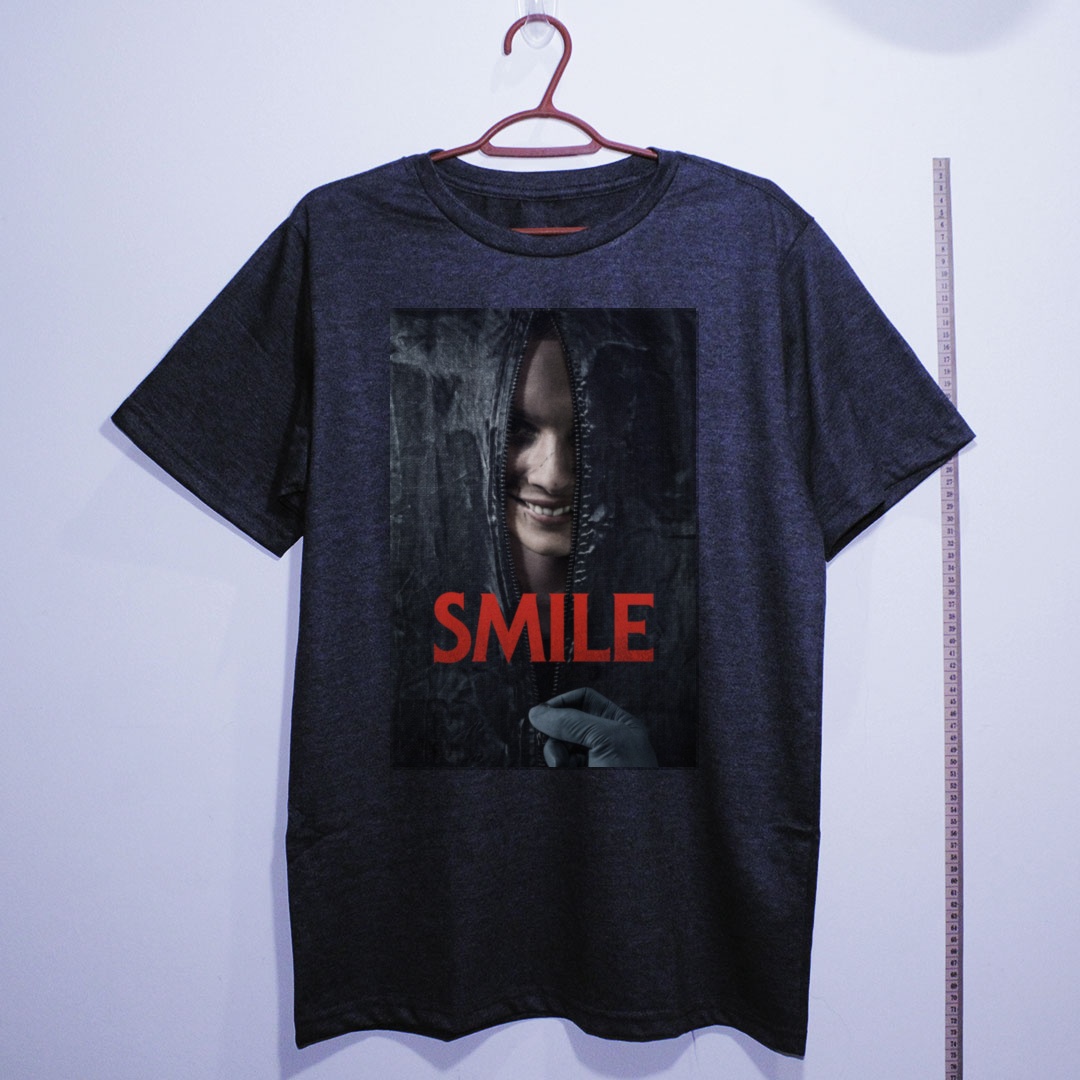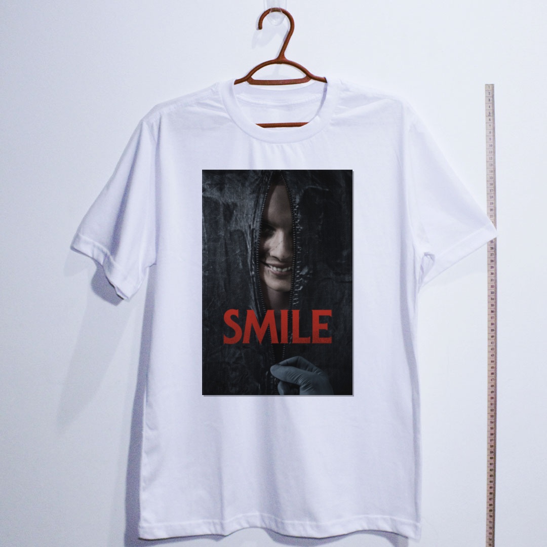 Em 2022, 'Smile' (Sorria) chegou às telas como uma das experiências mais perturbadoras do horror moderno. Dirigido por Parker Finn, o filme acompanha uma psiquiatra que testemunha algo inimaginável: um paciente sorrindo de forma macabra instantes antes de sua própria morte. A partir daí, ela é assombrada por uma entidade sobrenatural que usa o sorriso como arma — transmitindo seu terror de vítima a vítima como uma maldição contagiosa e inevitável. Com atmosfera de paranoia crescente, imagens que persistem na memória muito após os créditos e um estudo visceral sobre trauma e sobrenatural, 'Smile' firmou-se como fenômeno do horror contemporâneo, herdeiro espiritual dos grandes clássicos do gênero. Essa camiseta traz o terror direto do cinema para o seu guarda-roupa. Camiseta de algodão com estampa nítida e tecido macio. Disponível em diversos tamanhos.