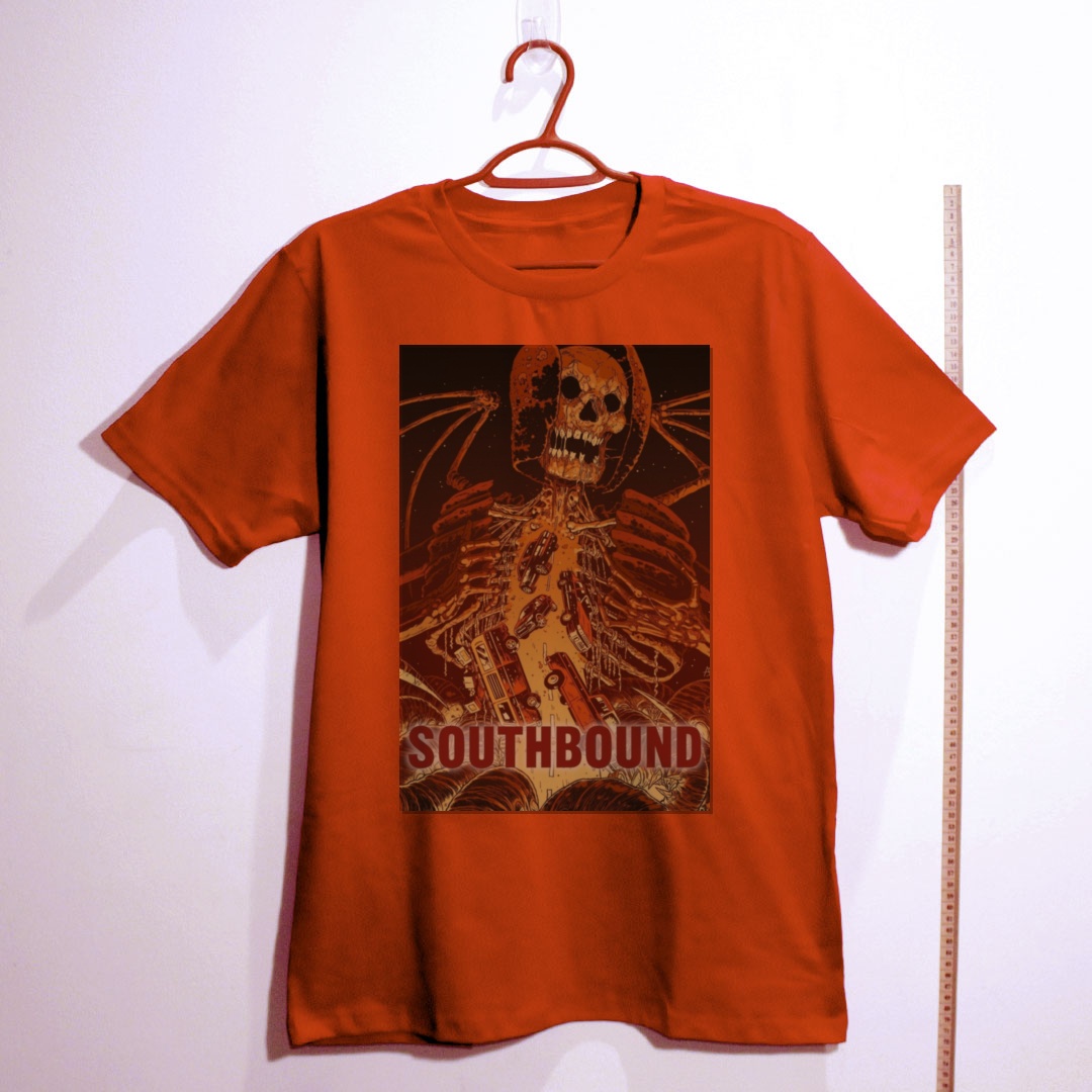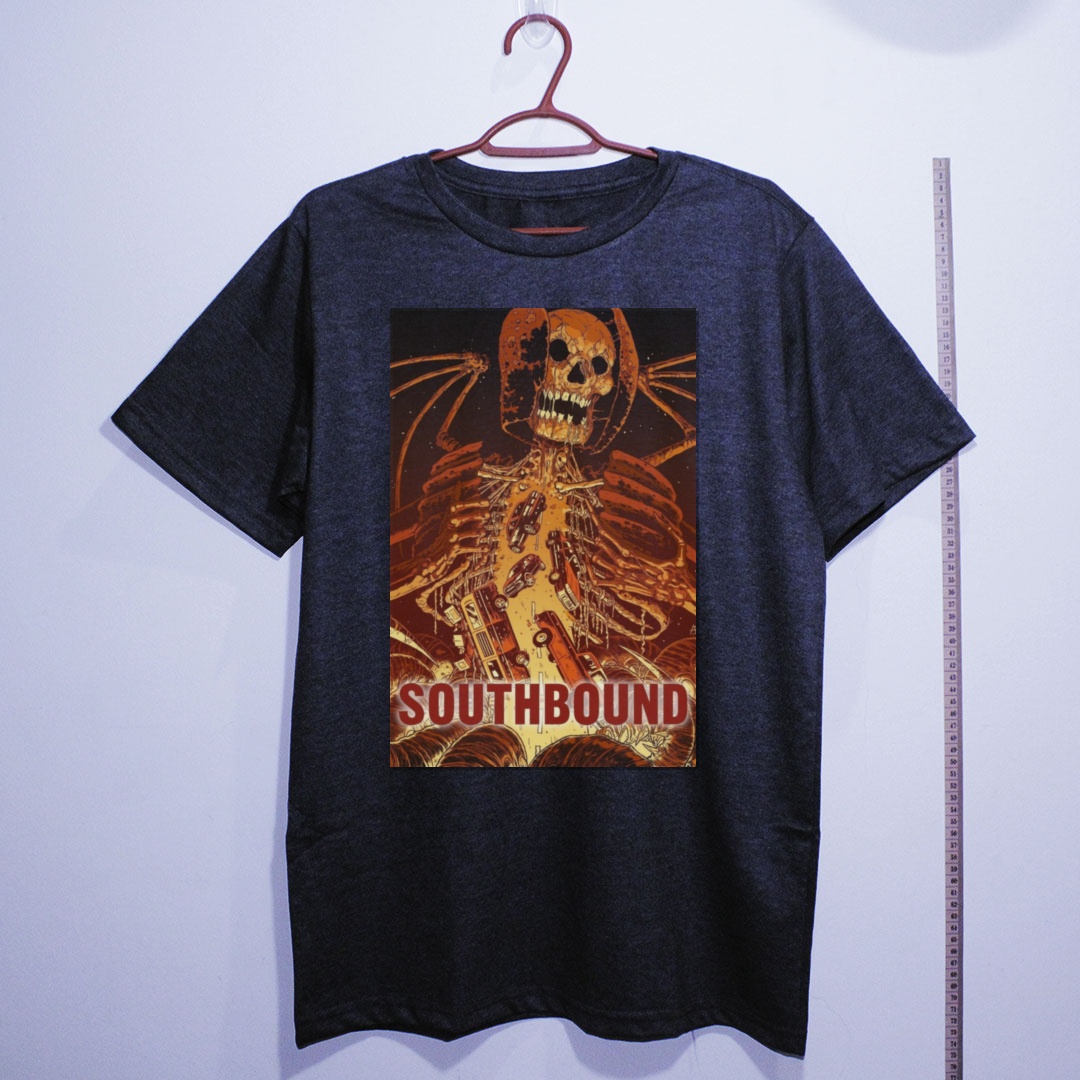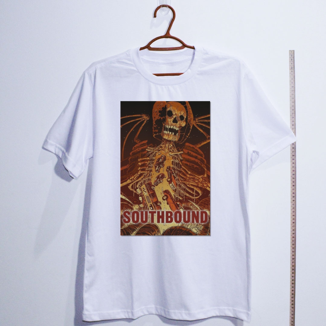 Southbound (2015) é uma antologia do horror americano que rapidamente se tornou cult entre os amantes do gênero. Ambientado numa rodovia desértica sem saída aparente, o filme tece histórias interligadas onde personagens tentam fugir — e inevitavelmente encontram — seus piores pesadelos. Criaturas sobrenaturais que pairam silenciosas no céu, rituais sinistros em casas isoladas, acidentes que não seguem nenhuma lógica humana: cada segmento entrega uma nova camada de horror visceral e atmosférico. Dirigido por múltiplos cineastas, incluindo Radio Silence e David Bruckner, Southbound é uma viagem sem retorno pelo deserto sobrenatural do medo. Um clássico moderno do horror cult que permanece gravado na memória como uma estrada que nunca termina. Essa camiseta traz o terror direto do cinema para o seu guarda-roupa. Camiseta de algodão com estampa nítida e tecido macio. Disponível em diversos tamanhos.