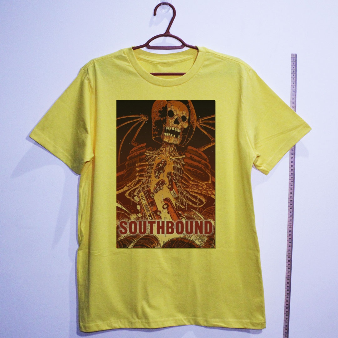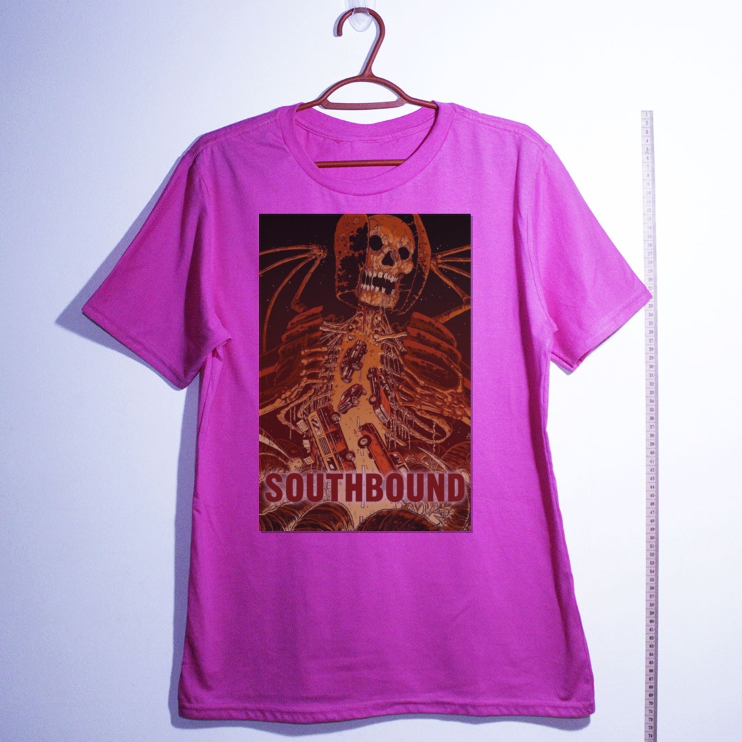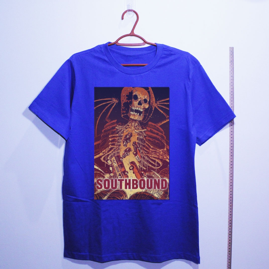 Southbound (2015) é uma antologia do horror americano que rapidamente se tornou cult entre os amantes do gênero. Ambientado numa rodovia desértica sem saída aparente, o filme tece histórias interligadas onde personagens tentam fugir — e inevitavelmente encontram — seus piores pesadelos. Criaturas sobrenaturais que pairam silenciosas no céu, rituais sinistros em casas isoladas, acidentes que não seguem nenhuma lógica humana: cada segmento entrega uma nova camada de horror visceral e atmosférico. Dirigido por múltiplos cineastas, incluindo Radio Silence e David Bruckner, Southbound é uma viagem sem retorno pelo deserto sobrenatural do medo. Um clássico moderno do horror cult que permanece gravado na memória como uma estrada que nunca termina. Essa camiseta traz o terror direto do cinema para o seu guarda-roupa. Camiseta de algodão com estampa nítida e tecido macio. Disponível em diversos tamanhos.