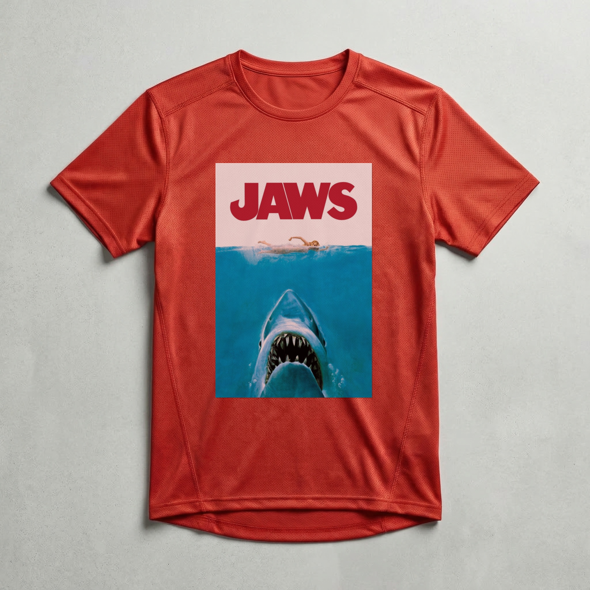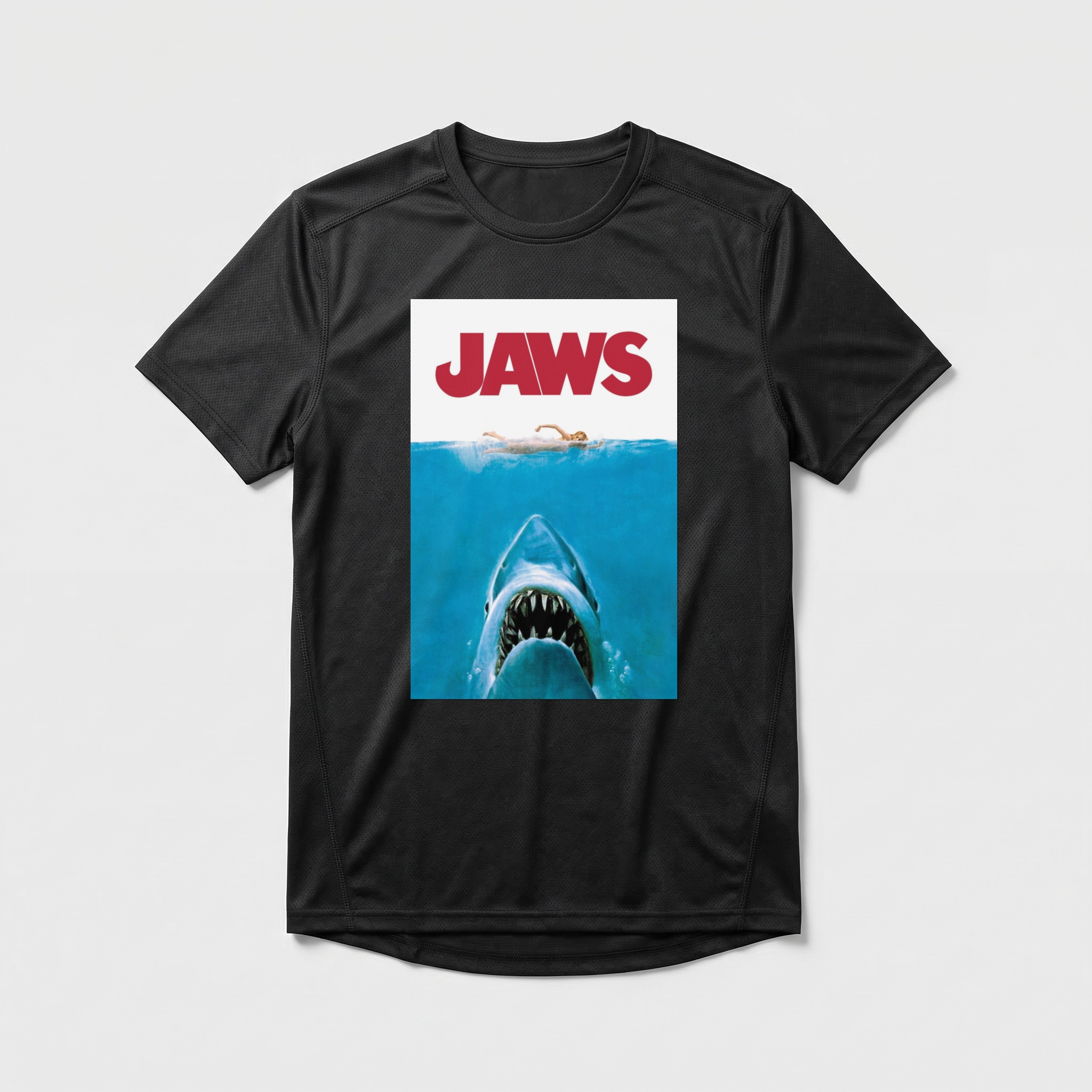 Em 1975, Steven Spielberg lançou ao mundo um terror primitivo e visceral: Jaws — Tubarão. Baseado no romance de Peter Benchley, o filme transformou o grande tubarão branco no símbolo máximo do horror das profundezas. A cena da praia, o tema inesquecível de John Williams, a mandíbula que emerge das águas escuras — tudo virou lenda do cinema fantástico. Jaws não apenas inventou o conceito de blockbuster de verão; ele fez gerações inteiras temerem colocar os pés no mar. O tubarão mecânico 'Bruce' tornou-se um ícone cult reverenciado até hoje, e a frase 'Você vai precisar de um barco maior' entrou para a história do horror cinematográfico. Um clássico absoluto para qualquer cinéfilo do gênero. Essa Dry Fit leva o horror com leveza e respirabilidade para qualquer lugar. Camiseta Dry Fit com tecido leve, respirável e secagem rápida.