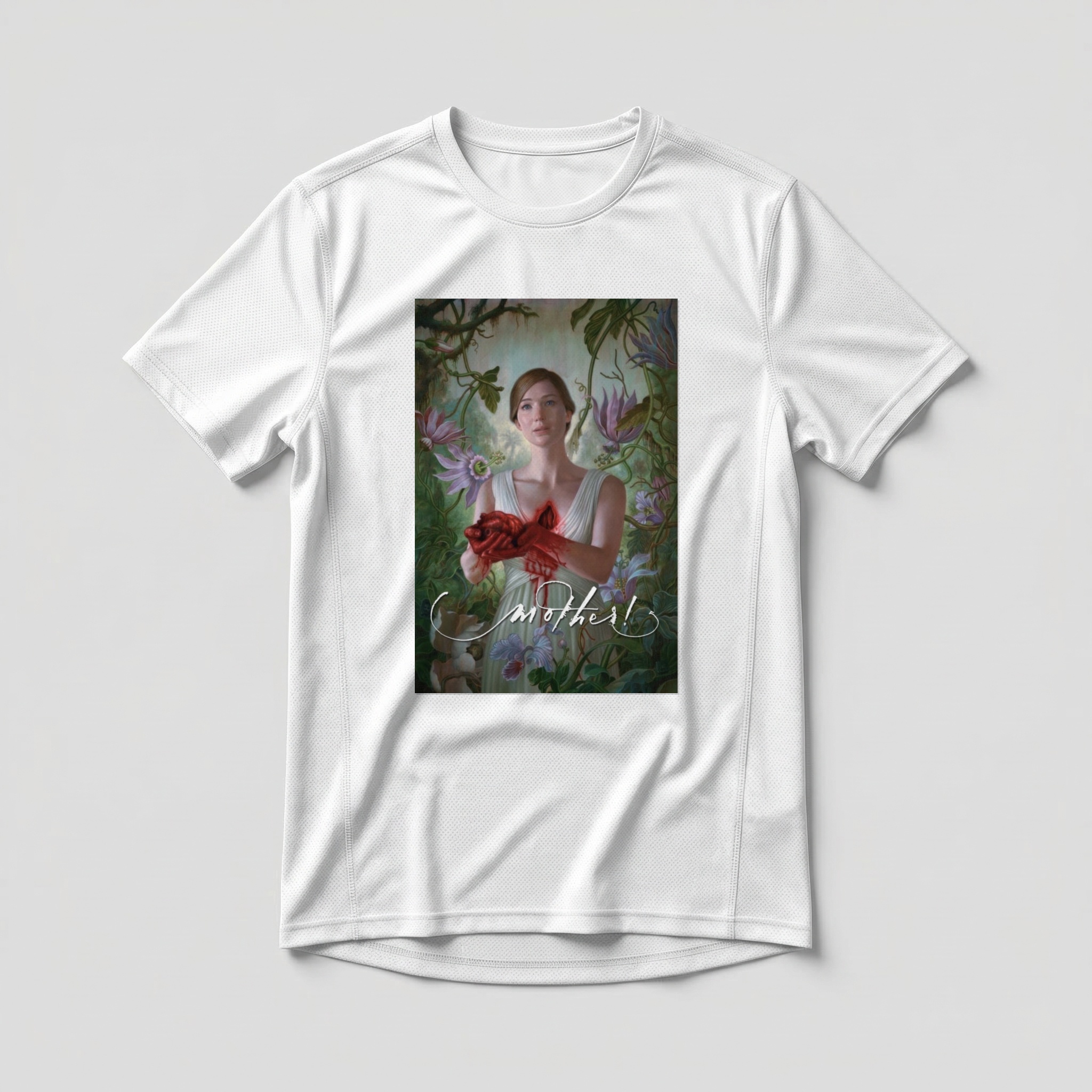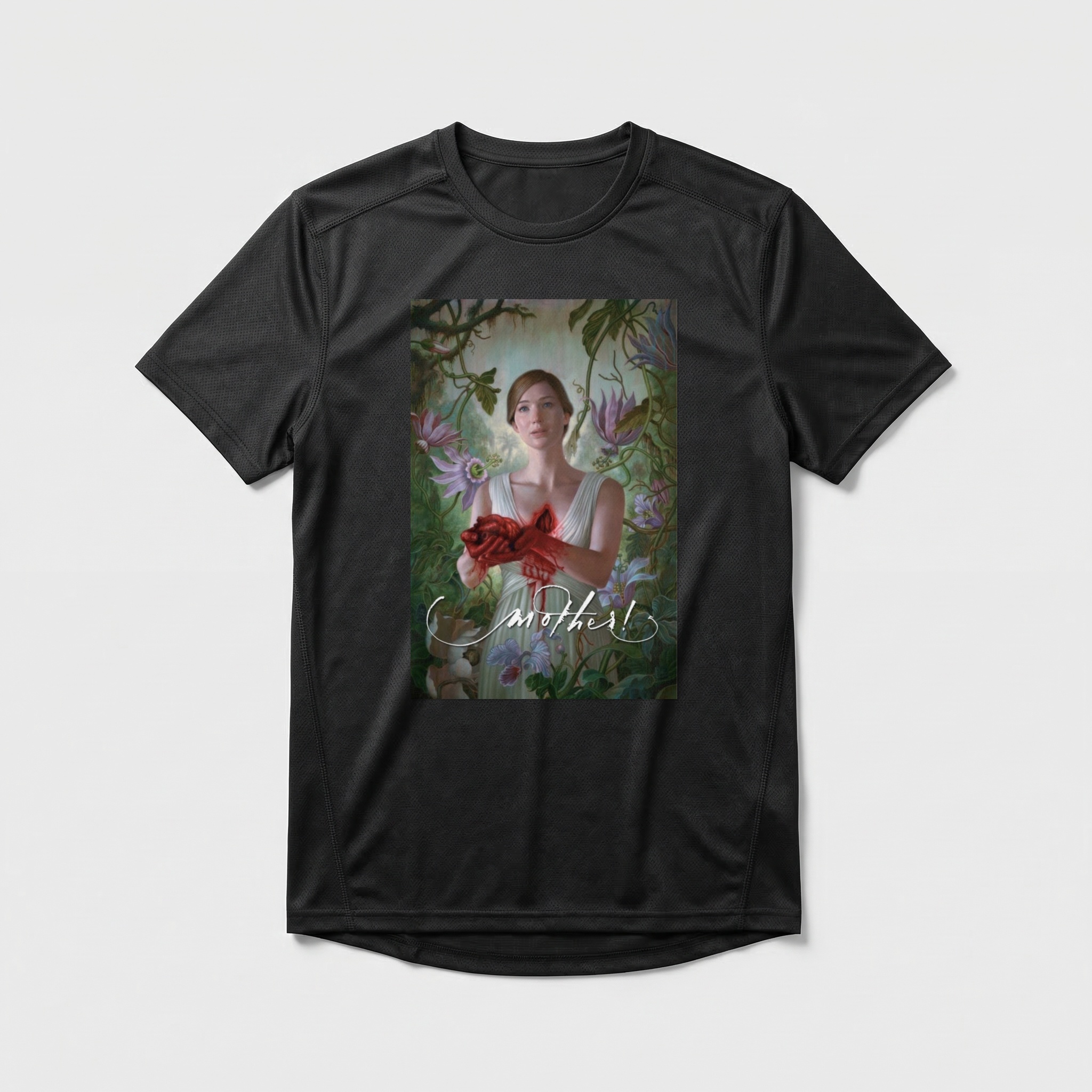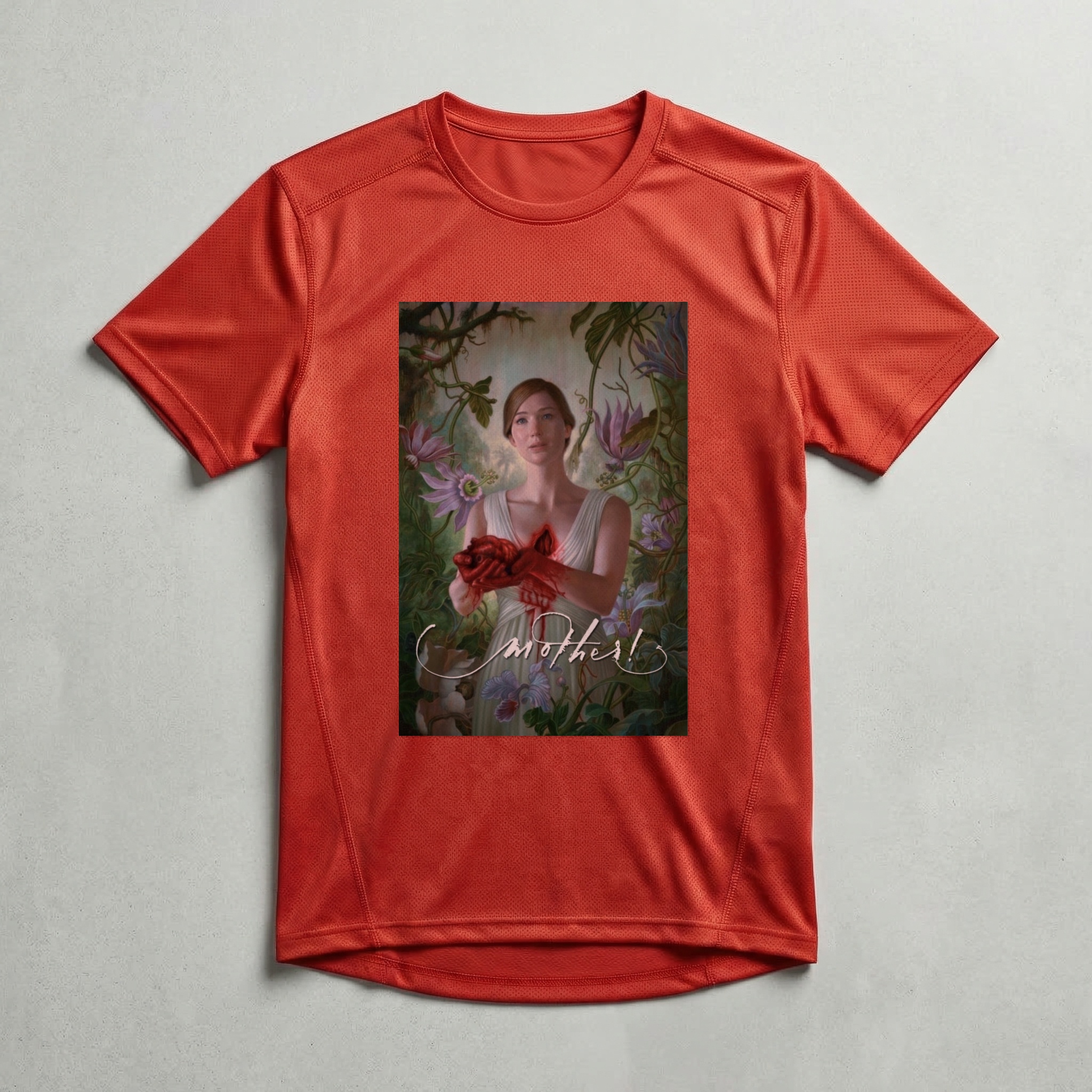 "mother!" (2017), de Darren Aronofsky, é um dos filmes de horror psicológico mais perturbadores e divisivos do cinema contemporâneo. Com Jennifer Lawrence e Javier Bardem, a obra mergulha o espectador num pesadelo claustrofóbico dentro de uma casa que respira, sangra e devora. Surreal, visceral e de uma violência alegórica esmagadora, o filme conquistou status cult entre os amantes do horror mais cerebral e perturbador — aquele tipo de cinema que não abandona quem assiste, ele persegue. Uma experiência que só Aronofsky poderia criar: densa, sufocante e impossível de esquecer. Essa Dry Fit leva o horror com leveza e respirabilidade para qualquer lugar. Camiseta Dry Fit com tecido leve, respirável e secagem rápida.
