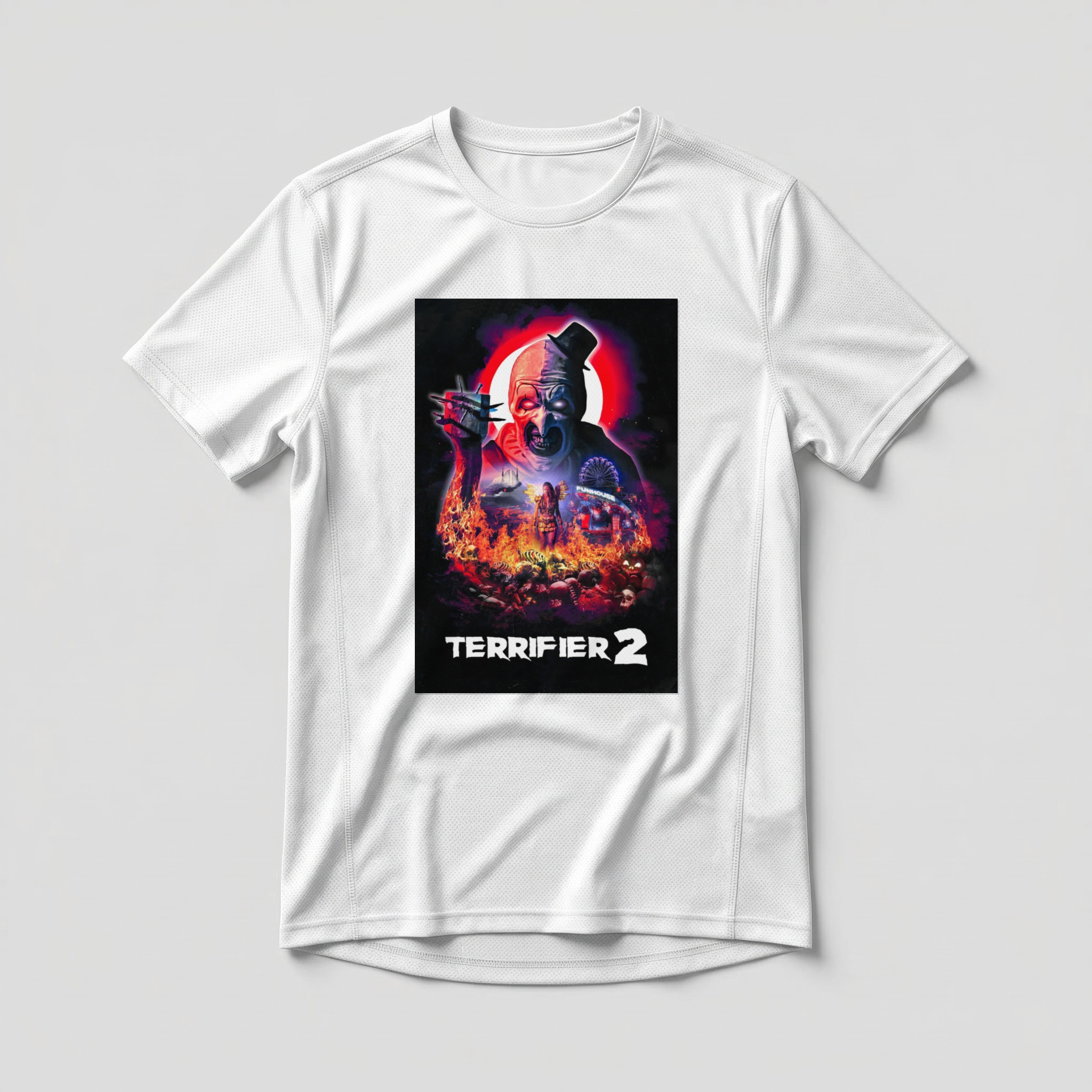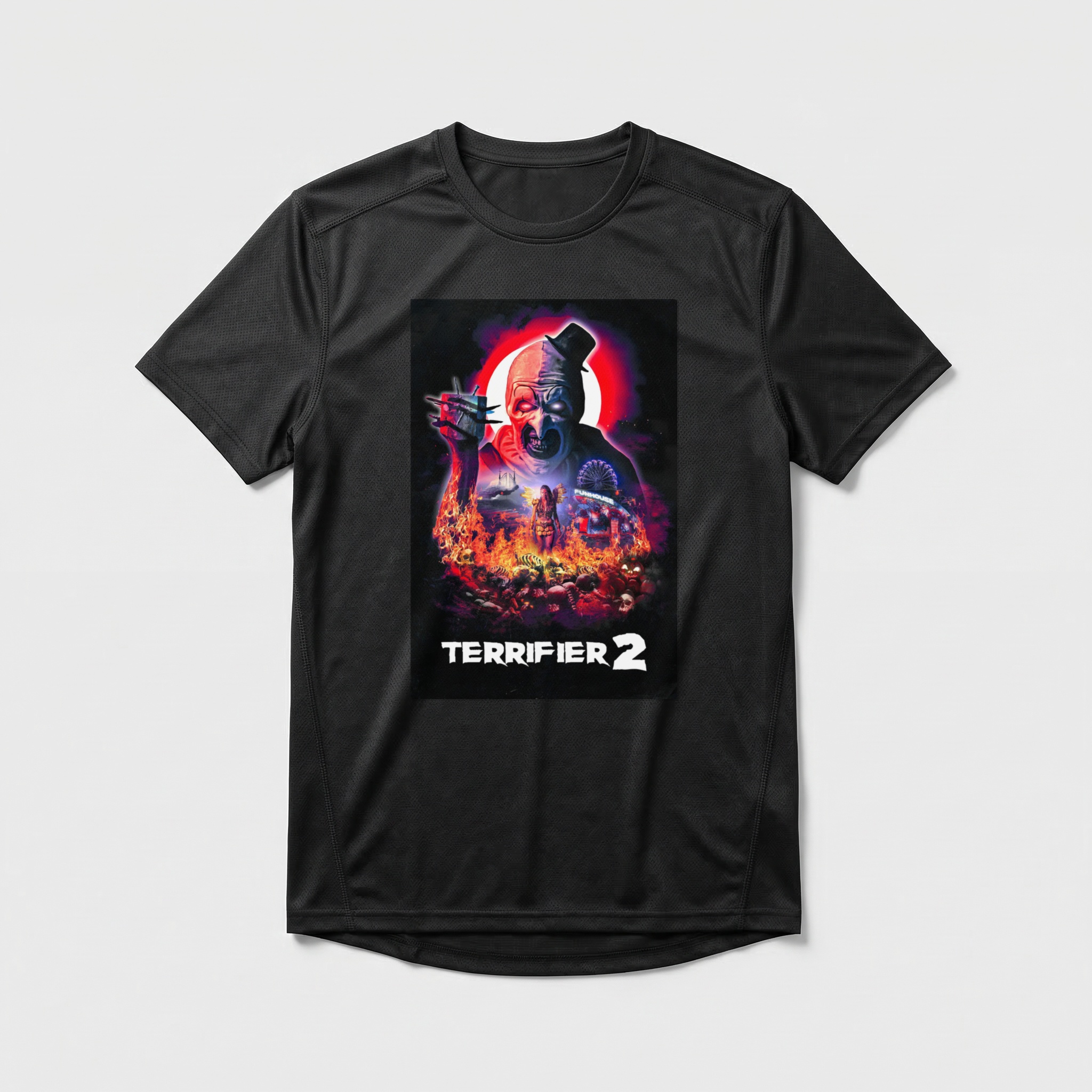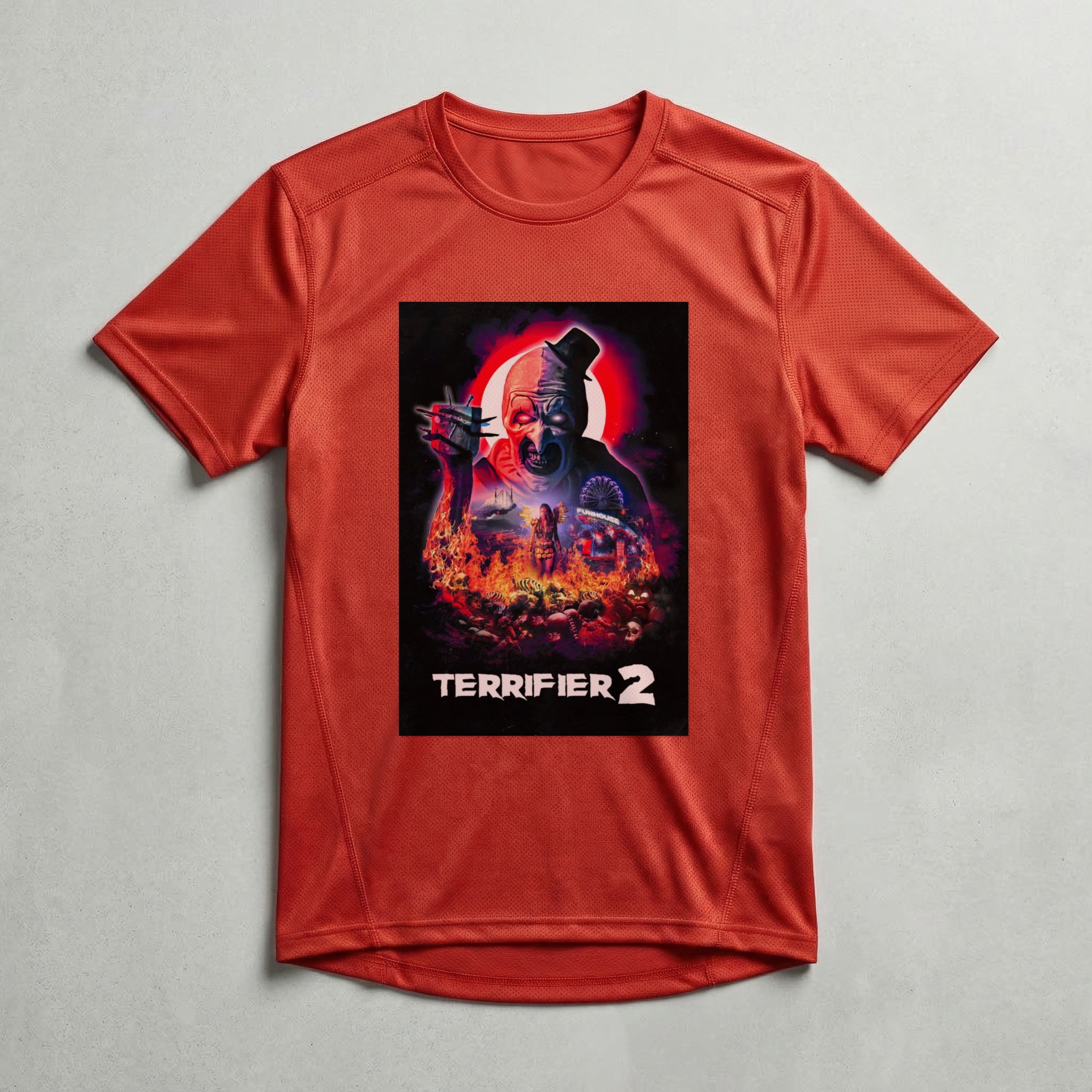 Terrifier 2 (2022), dirigido por Damien Leone, redefiniu os limites do slasher moderno com uma brutalidade quase ritualística. Art the Clown — o palhaço silencioso e de origem sobrenatural — retorna das cinzas para semear caos e morte em uma nova noite de Halloween. Considerado um dos filmes mais violentos da história do cinema de horror independente, a produção chocou plateias ao redor do mundo e consagrou Art the Clown como um dos grandes ícones do terror contemporâneo. Gore visceral, atmosfera opressiva e um villain que não obedece às leis da morte: Terrifier 2 é um pesadelo que não pede licença para entrar. Essa Dry Fit leva o horror com leveza e respirabilidade para qualquer lugar. Camiseta Dry Fit com tecido leve, respirável e secagem rápida.