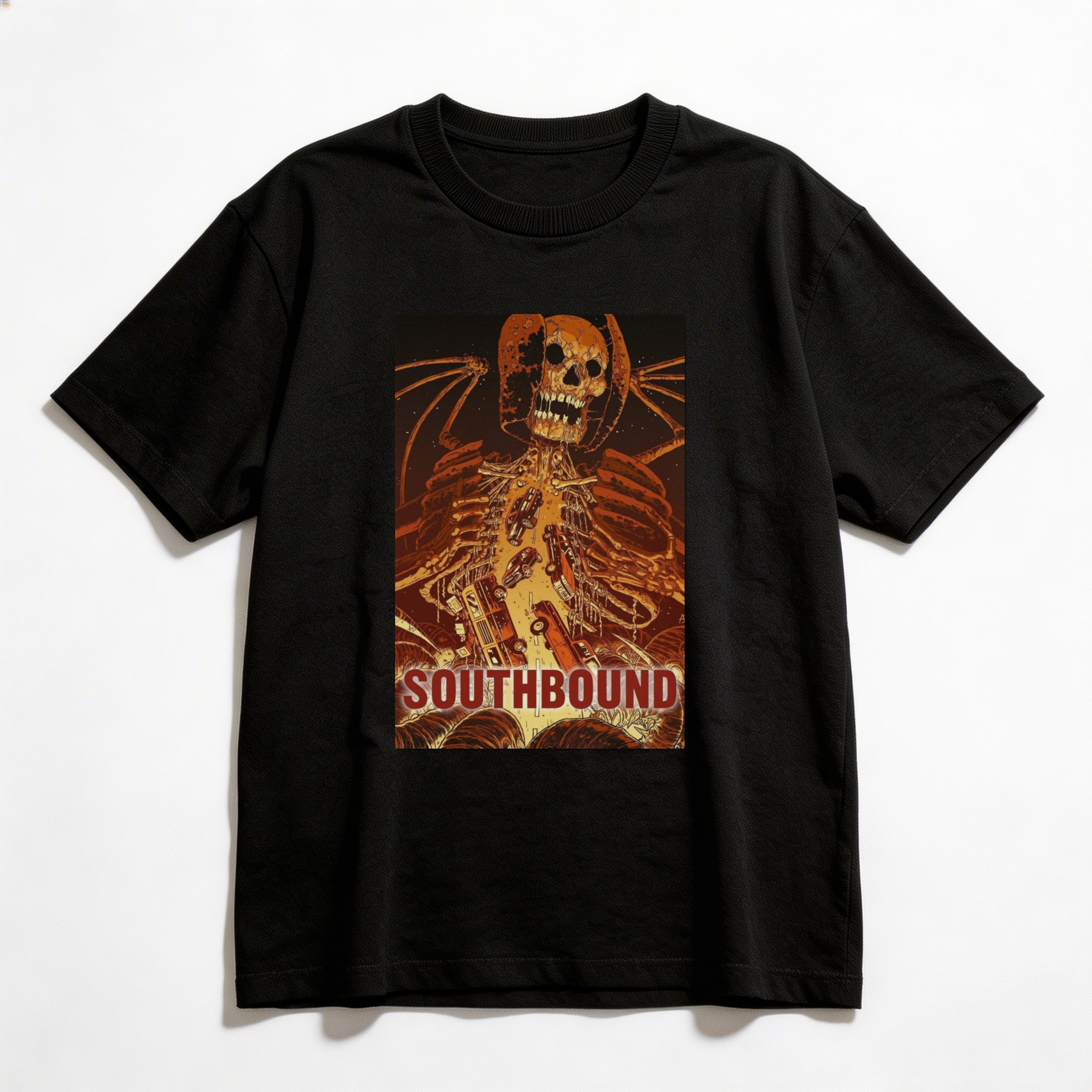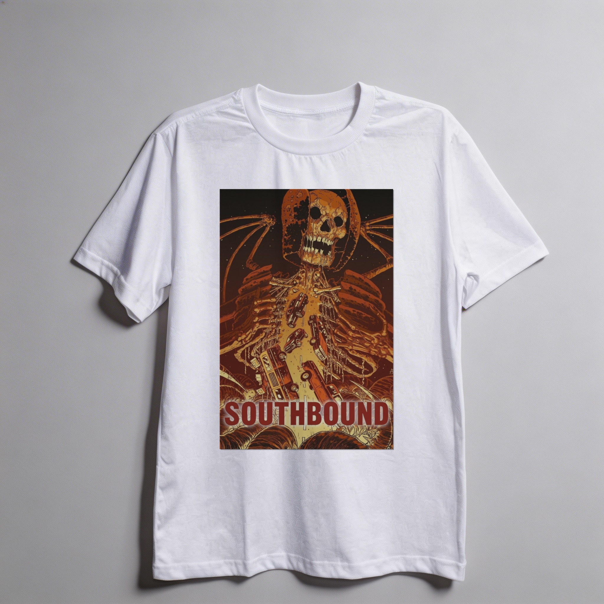 Southbound (2015) é um dos filmes de antologia mais perturbadores do horror contemporâneo. Dirigido por um coletivo de cineastas — incluindo Radio Silence, David Bruckner e Roxanne Benjamin —, o longa apresenta cinco histórias interligadas que se passam numa estrada deserta e amaldiçoada no sudoeste americano. Não há saída. Não há redenção. Cada episódio alimenta o seguinte numa estrutura circular e cruel: fugitivos assombrados por criaturas sem rosto, uma banda perdida em uma cidade de pesadelo, uma família que tenta resgatar o que não pode ser salvo. O filme captura a essência do horror de estrada com precisão sobrenatural — a estrada não termina, o mal não persegue: ele espera. Um cult que reuniu fãs do gênero ao redor do mundo pela sua atmosfera opressiva e pela forma como entrelaça destino, culpa e o inexplicável. Na oversized, o terror ganha corte amplo e presença sombria. Camiseta oversized com corte amplo e tecido confortável.