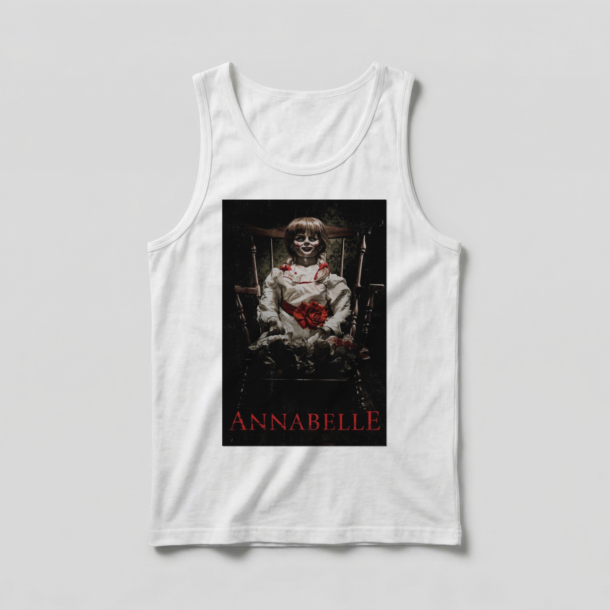 Annabelle é uma das presenças mais perturbadoras do terror sobrenatural contemporâneo. Baseada em um caso real investigado pelos paranormalistas Ed e Lorraine Warren, a boneca original — uma inofensiva Raggedy Ann — teria servido de veículo para uma entidade maligna nas décadas de 1970. O Universo Conjuring reinterpretou Annabelle como a icônica boneca de porcelana de olhos vazios, transformando-a em símbolo do medo atávico que os humanos nutrem por objetos inanimados que parecem observar. Cult instantâneo, a saga gerou três longas-metragens e consolidou a boneca entre os ícones mais reconhecíveis do horror moderno — aquele sorriso imóvel que esconde o inominável. Na regata, o terror ganha leveza e atitude sombria. Camiseta regata leve e confortável com estampa nítida.
