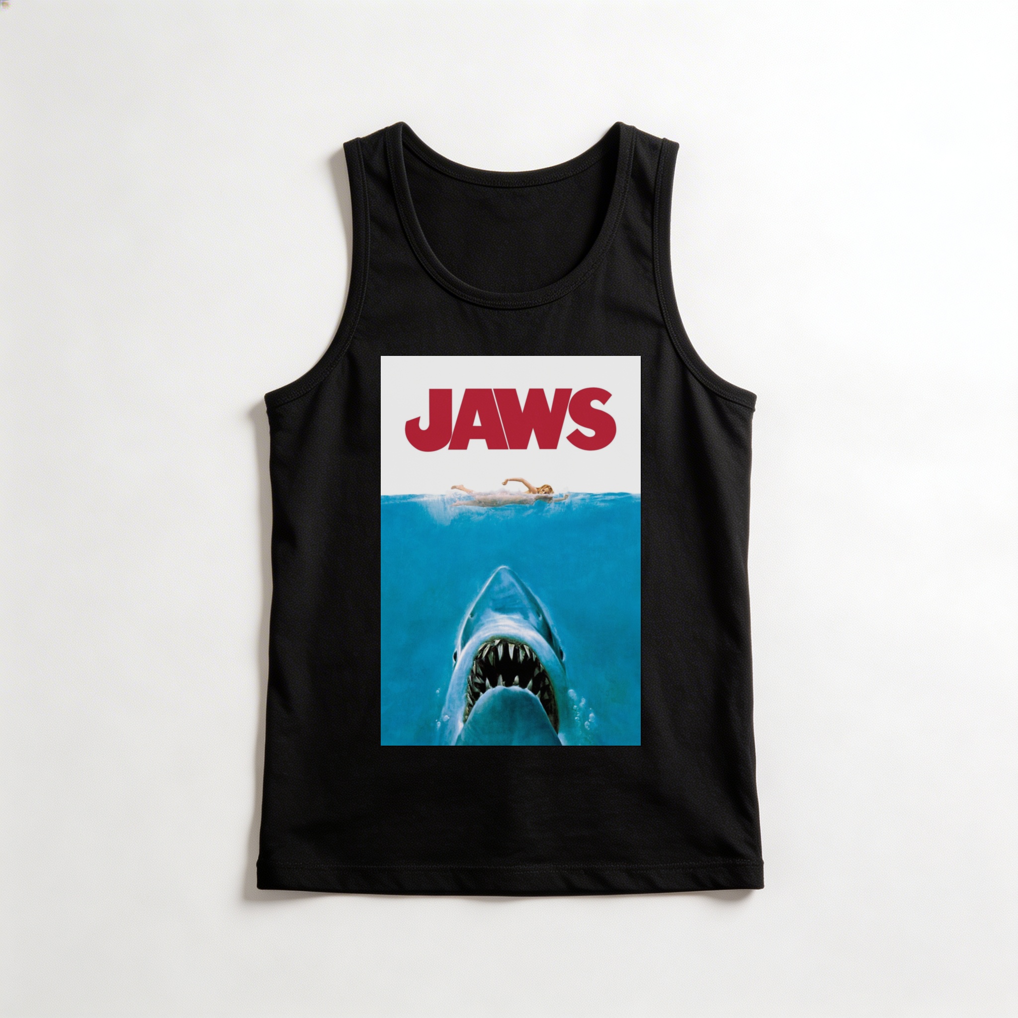 Camiseta regata Tubarão (Jaws) — clássico cult de Spielberg em estampa nítida, leve e sem mangas.