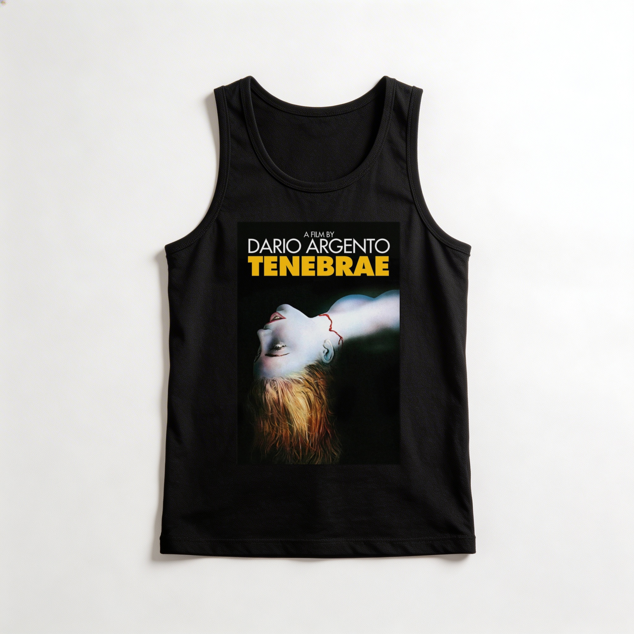 Tenebre (1982), obra-prima do mestre italiano Dario Argento, é um dos pilares do giallo — subgênero do horror europeu marcado por assassinatos estilizados, suspense psicológico e fotografia de tirar o fôlego. Nesse thriller sombrio e perturbador, um romancista americano chega a Roma e se vê envolto em uma série de crimes que espelham os de seus próprios livros. Com trilha sonora arrepiante e uma atmosfera densa que mistura terror visceral, estética noir e paranoia crescente, Tenebre consolidou Argento como um dos maiores gênios do horror cult mundial. Cada cena é uma pintura macabra; cada sombra esconde um segredo. Clássico absoluto do cinema fantástico e sobrenatural, o filme segue sendo cultuado por cinéfilos do gênero ao redor do mundo. Na regata, o terror ganha leveza e atitude sombria. Camiseta regata leve e confortável com estampa nítida.