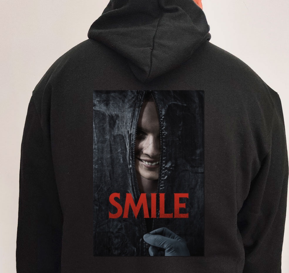 Em 2022, Parker Finn assombrou salas de cinema ao transformar o gesto mais banal do cotidiano — um simples sorriso — no símbolo máximo do horror sobrenatural. Smile (Sorria) segue uma psiquiatra que testemunha o suicídio perturbador de uma paciente e começa a ser perseguida por uma entidade maligna que se manifesta através de sorrisos grotescos e distorcidos em rostos conhecidos. A maldição se propaga como vírus invisível entre aqueles que presenciam mortes traumáticas, criando um ciclo de pavor sem saída aparente. O longa conquistou o status de cult instantâneo no gênero sobrenatural contemporâneo, provando que o terror mais eficaz não precisa de monstros — precisa apenas de um rosto familiar com a expressão errada. Nesse moletom, o terror aquece nas noites mais sombrias. Moletom com capuz, bolso canguru e tecido confortável.
